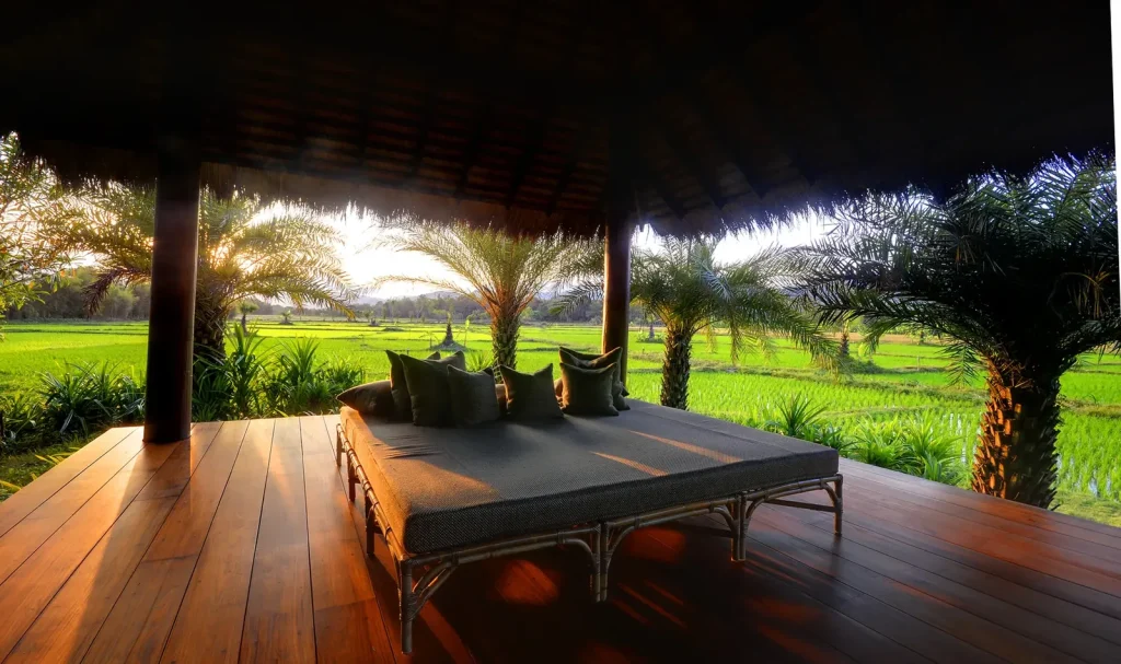 The crown jewel of Tatvani’s villas is Kohaku – an exquisite sanctuary crafted from solid golden teak and designed for those seeking the ultimate escape. Spacious, elegant, and bathed in natural light, this two-bedroom villa spans over 1,300 square metres (10,650 square feet) of open-plan luxury. Thoughtfully adorned with modern European furnishings and contemporary art, Kohaku is the perfect retreat for honeymooners or couples looking to indulge in an unforgettable getaway. Kohaku boasts sweeping views across Tatvani’s rice fields, stretching all the way to the misty mountains of Myanmar.